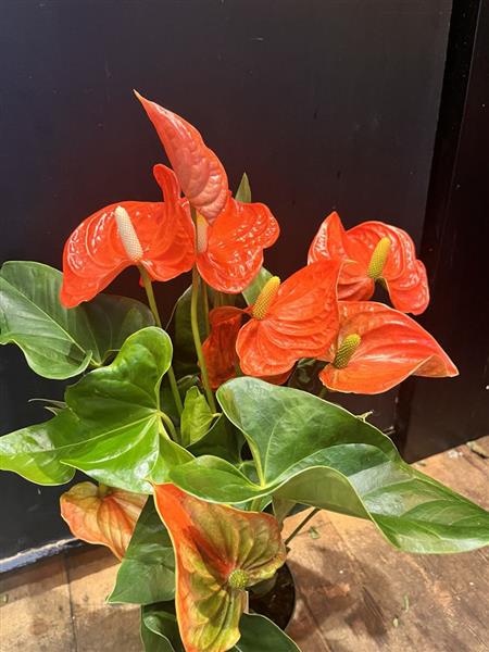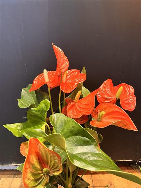 An Anthurium, commonly known as a flamingo flower or laceleaf. Anthuriums are known for their striking, glossy green leaves and distinctive waxy spathes, which are often white, pink, or red, surrounding a yellow spadix1. They are popular ornamental plants due to their unique and attractive appearance.