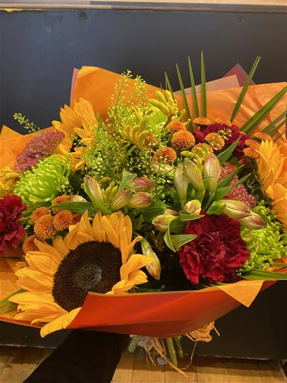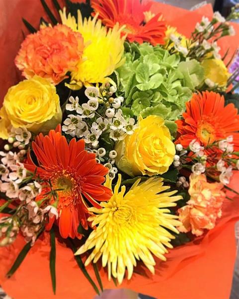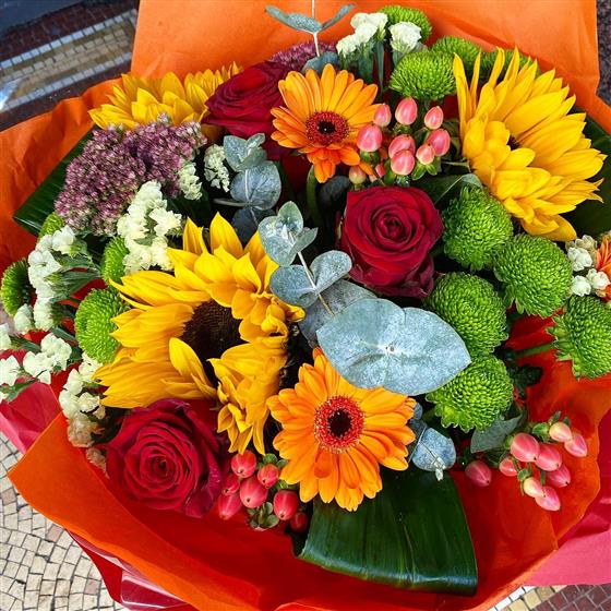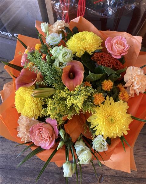 A bright, compact bouquet in a spiral gift wrap. This bouquet will be the florist's choice of blooms which will mostly consist of rich oranges, reds and yellows.