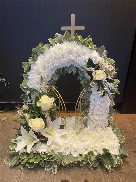 A massed tribute of white chrysanthemums with sprays available as pictured, in peaches and blues, or in your choice of colour.