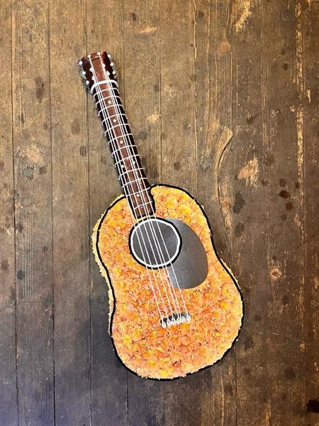 A striking and heartfelt tribute crafted in the shape of an acoustic guitar.