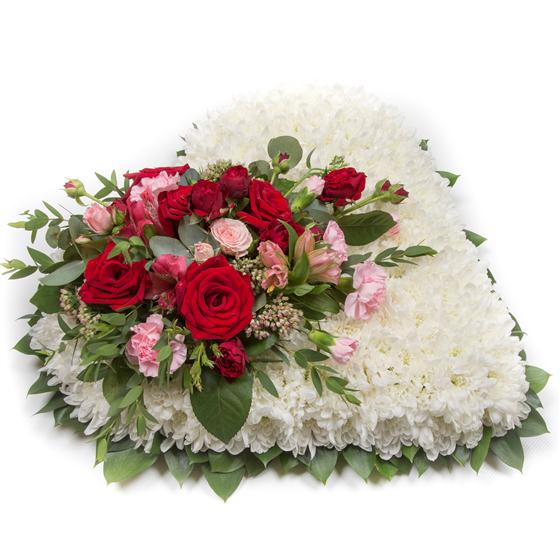 A massed heart shaped tribute with a deep red and baby pink spray, including roses, alstromeria and spray carnations. Available with a foliage or ribbon surround in a variety of colours.
