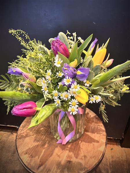 Vibrant Tulips with fresh Thlaspi and delicate Tansie for a natural and harmonious touch. Stylishly displayed in a clear ribbed vase and finished off with a complimenting ribbon.