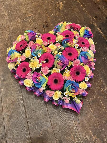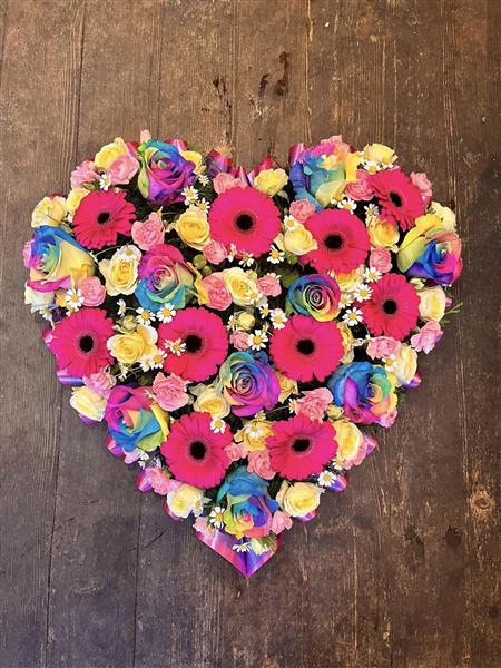 A beautiful multi coloured heart including unique rainbow roses.