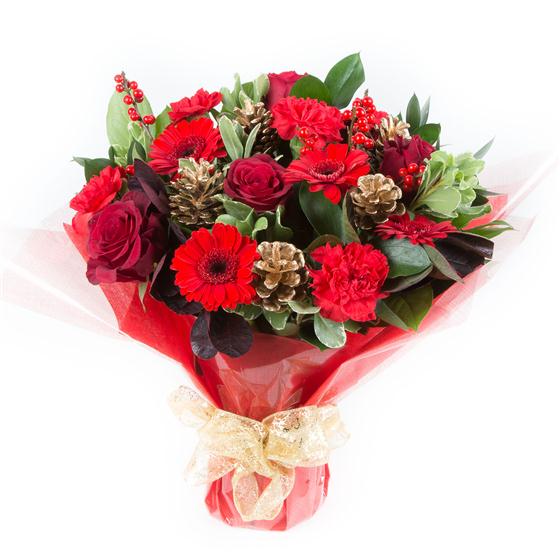 Our most popular Christmas bouquet. A fresh, seasonal hand-tie with selection of florist choice seasonal blooms in festive reds or winter whites.