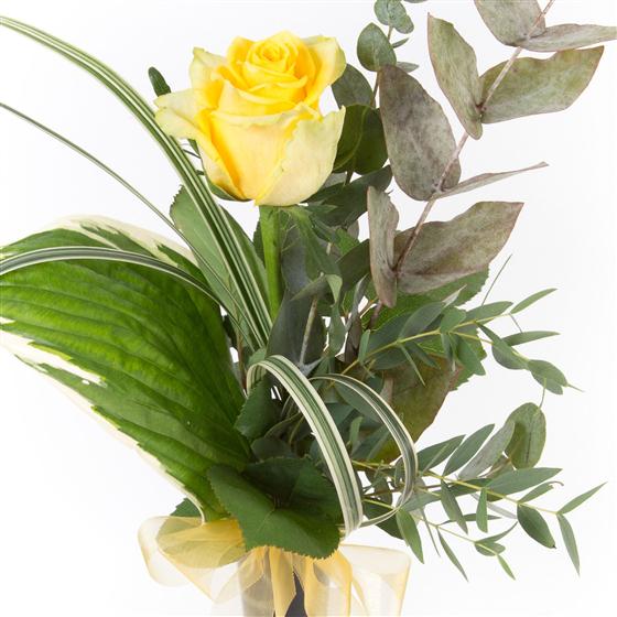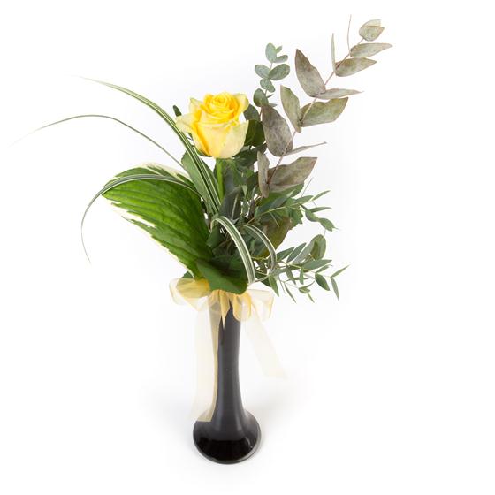 A single long stemmed yellow rose presented in a vase with mixed foliage sends a simple message.
