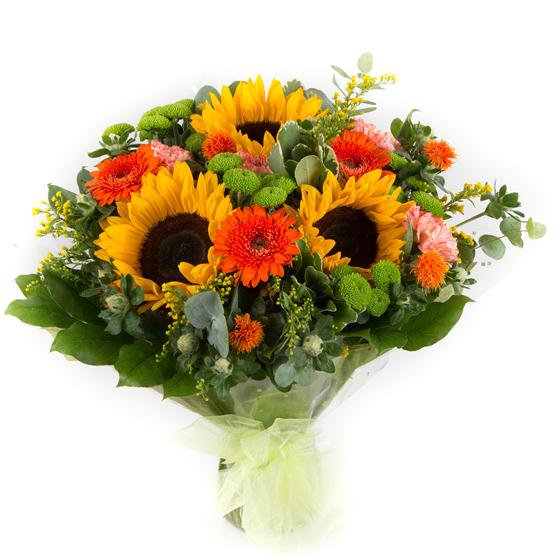 Sunflowers, mini gerberas and lime green kermit chrysanthemums hand-tied with seasonal foliage and golden solidaster.