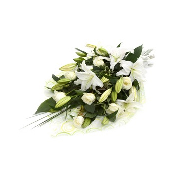 Traditional bouquet in modern theme with choice luxury white flowers and foliage.