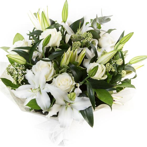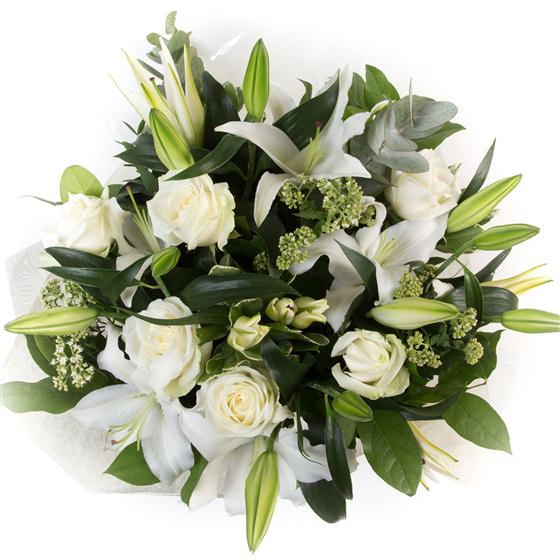 A fragrant hand-tied bouquet of oriental lilies and white roses mixed with eucalyptus. Displayed in our new luxury gift boxes.