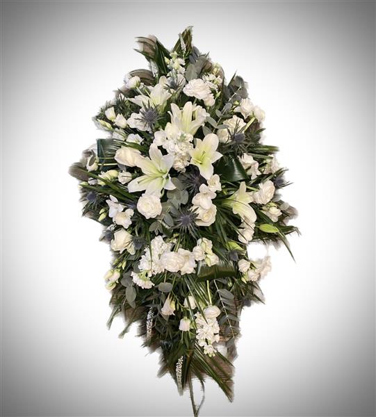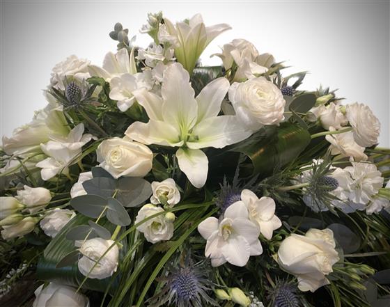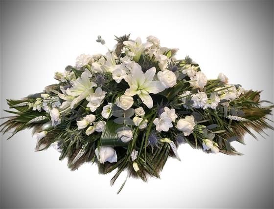 A classic all white oriental lily and rose casket spray with blue eryngium thistles with a complimenting mix of white flowers and eucalyptus foliage. Please give ample time when ordering to ensure lilies are in full bloom.